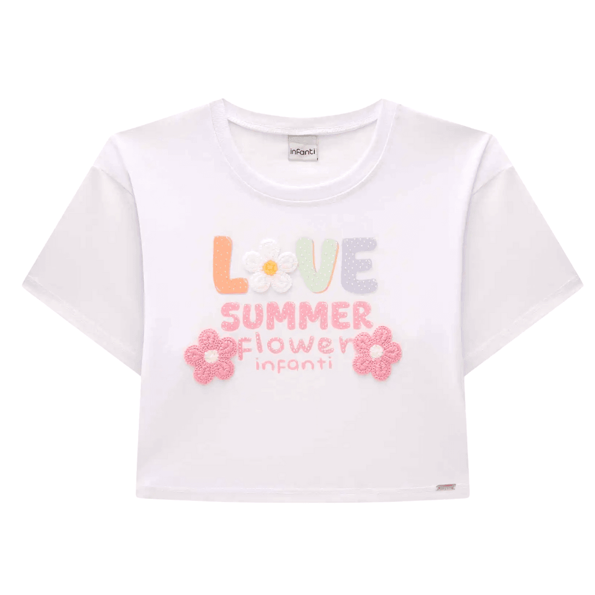 Roupa infantil Infanti. A blusa love em malha é a escolha perfeita para adicionar um toque de delicadeza e conforto ao guarda-roupa da sua pequena. Ela oferece um toque suave e agradável à pele, ideal para o dia a dia. Ainda conta com aplique em crochê, adicionando um charme especial à peça.