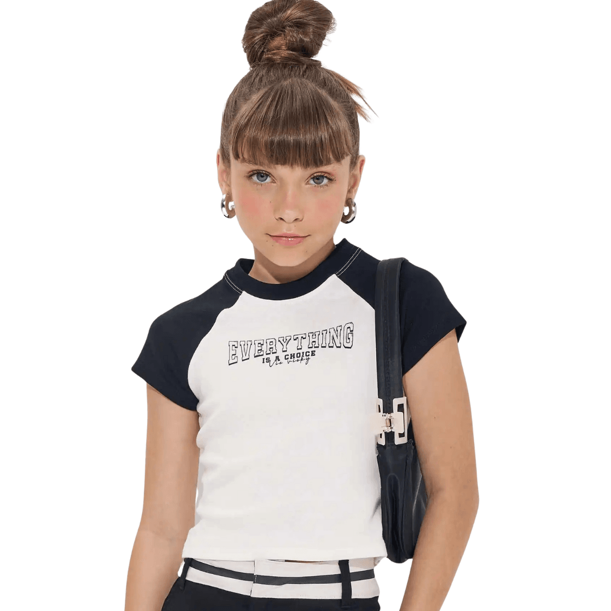 Roupa juvenil Vic&Vicky. A blusa raglan baby look em ribana é a peça perfeita para as garotas que amam um visual descolado e confortável, com uma modelagem moderna e estampa divertida. É ideal para compor looks cheios de personalidade.