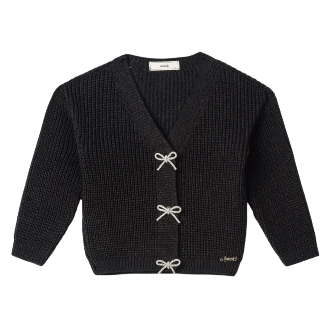 Roupa Infantil Animê. O cardigan preto Infantil Animê é uma peça essencial para o inverno. Confeccionado em tricot, destaca-se pelos laços frontais em strass, adicionando um toque de brilho. Os botões de pressão proporcionam praticidade no vestir, ideal para as pequenas fashionistas, este cardigan combina estilo e conforto.