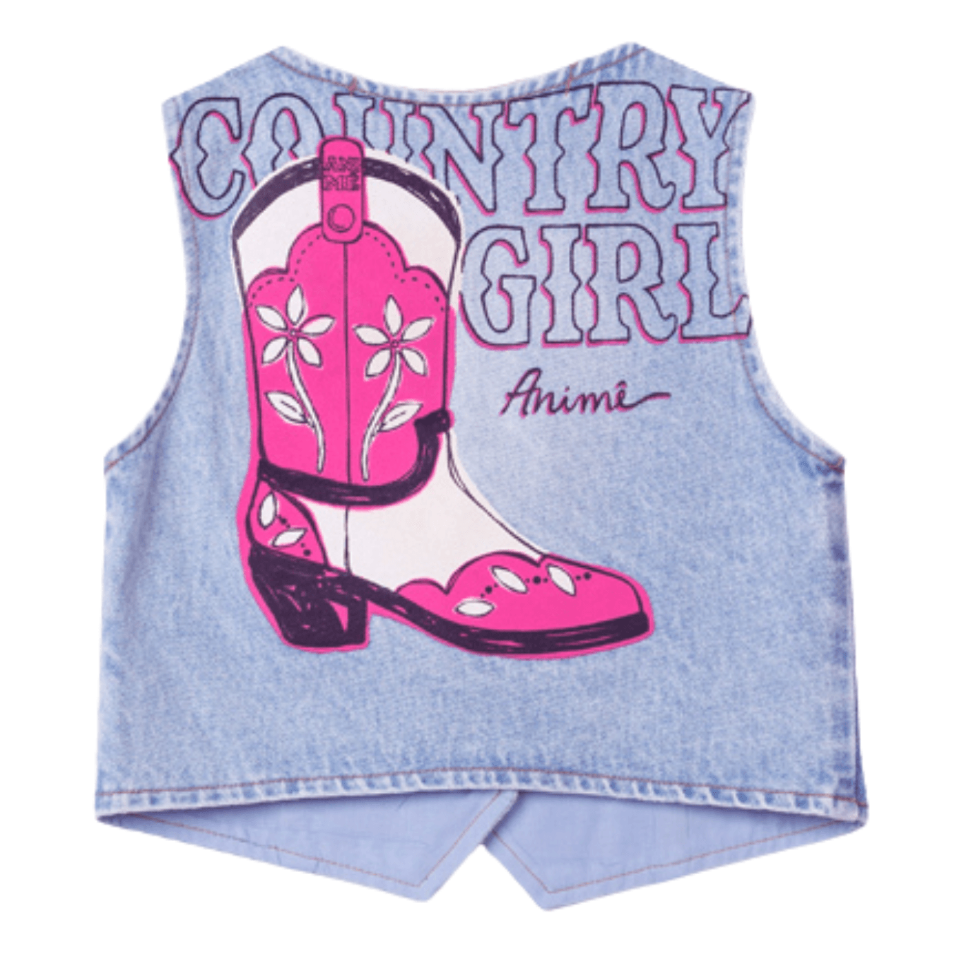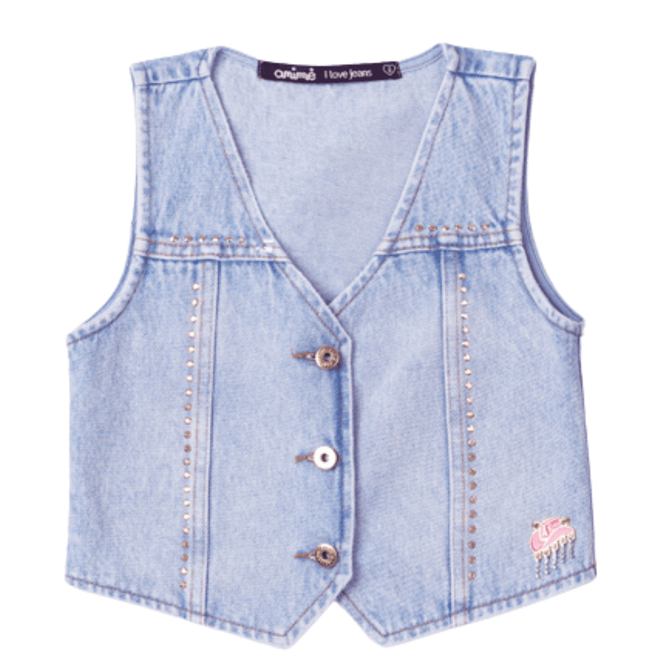 Roupa Infantil Animê. Colete jeans infantil com aplicação de strass, moderno e versátil, ideal para sobreposições cheias de estilo. Perfeito para atualizar produções casuais com toque fashion.