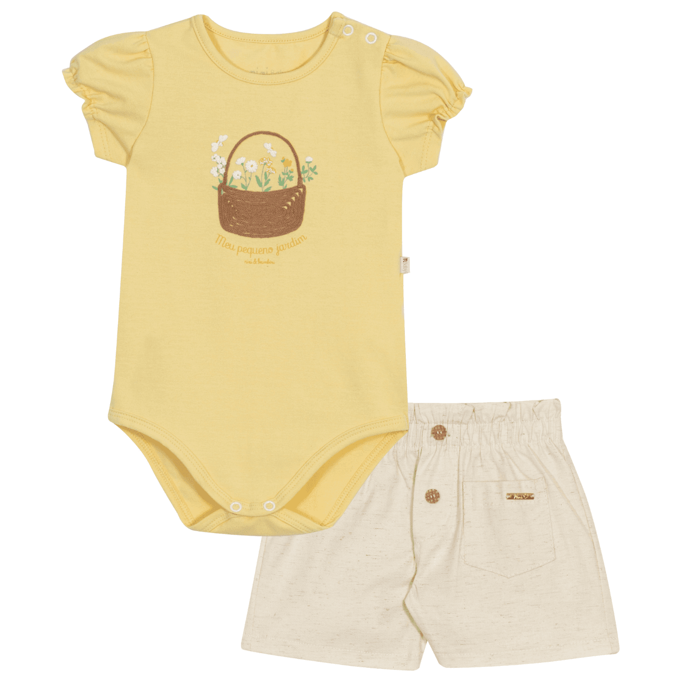 Roupas de bebê Nini & Bambini. Conjunto para bebê menina, de short em tecido plano com linho e body em cotton.