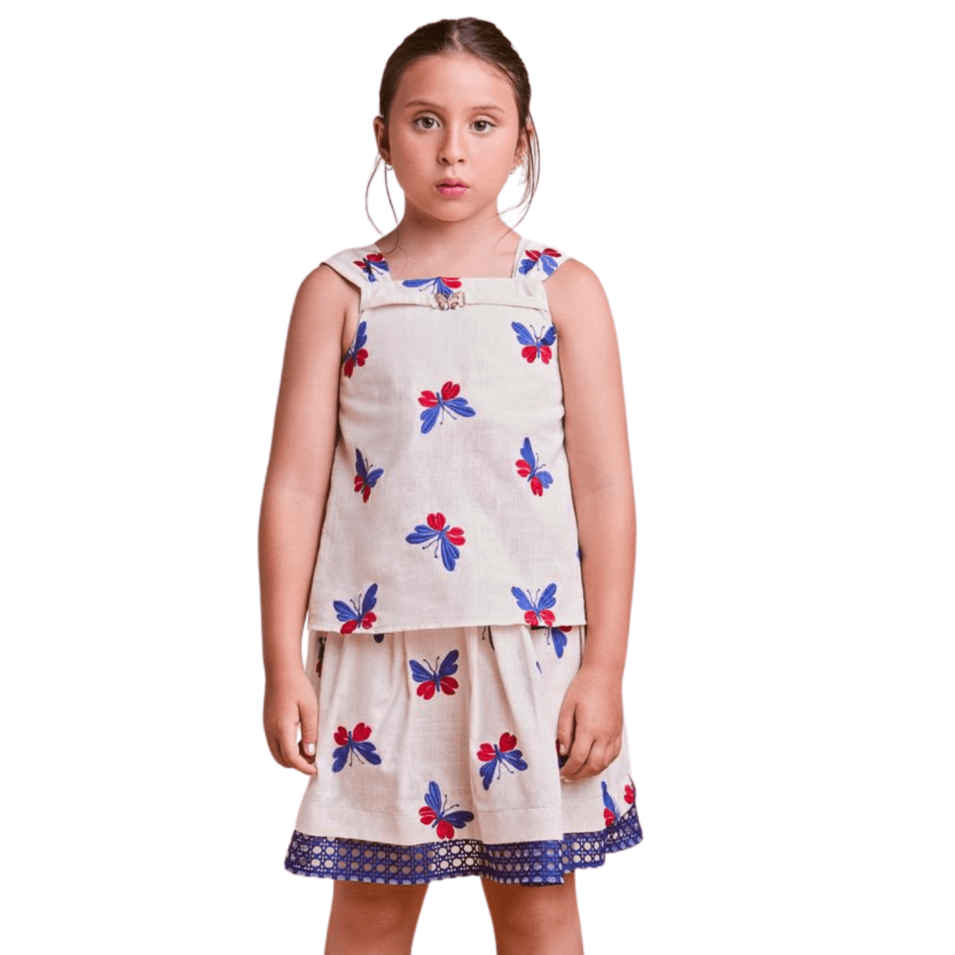 Roupa Infantil Animê. Encantador e poético, o conjunto traz saia e blusa com bordados de borboletas que transmitem leveza e delicadeza. Os detalhes criam um visual romântico e sofisticado, perfeito para ocasiões especiais em que cada detalhe importa. Uma produção que traduz feminilidade e charme em cada movimento.