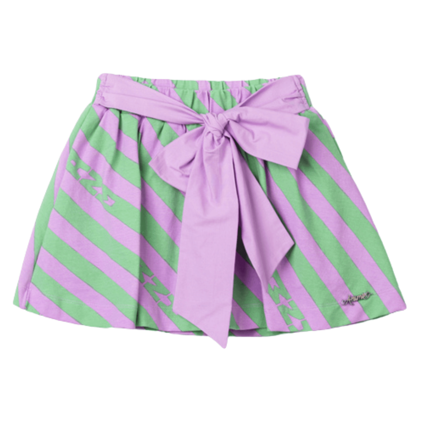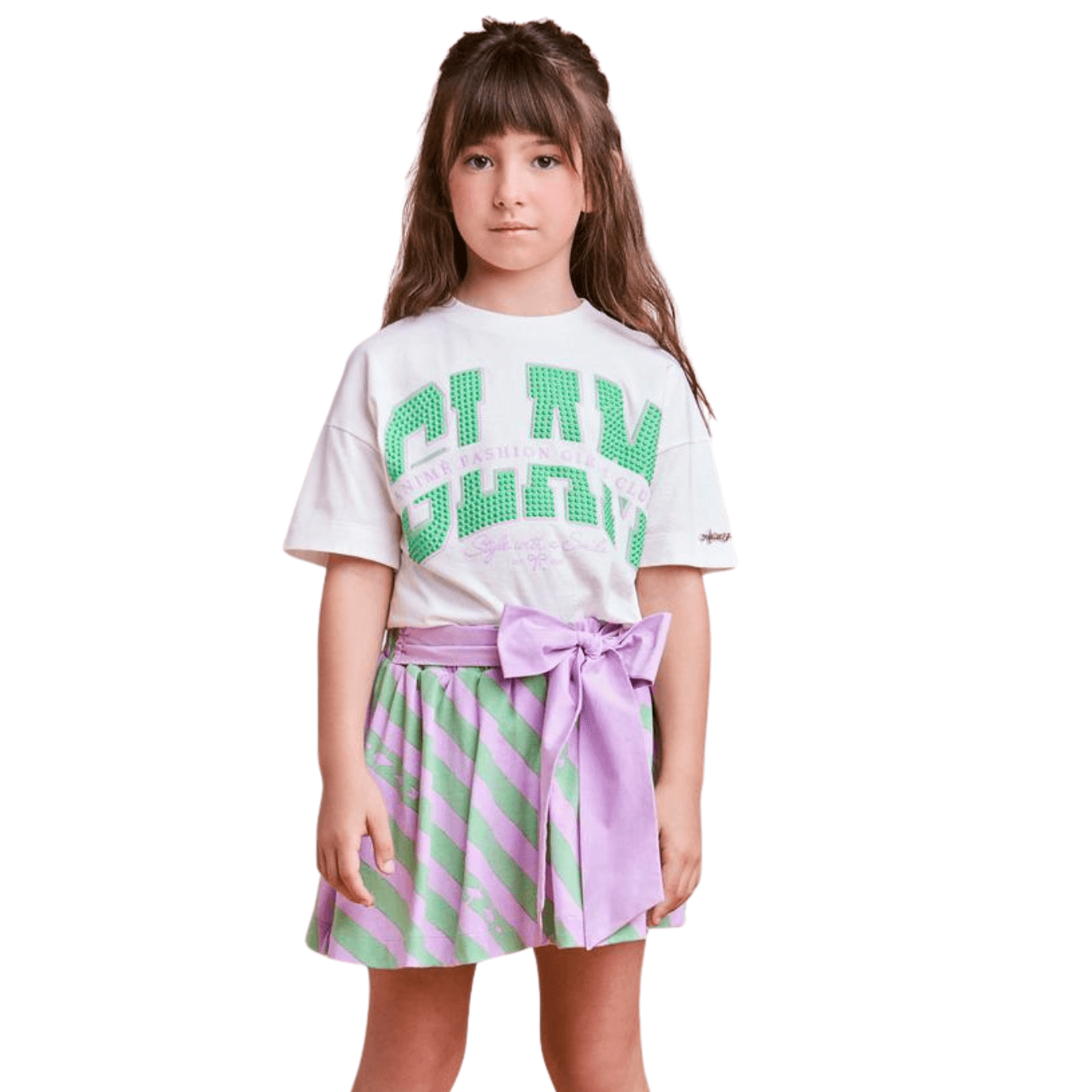 Roupa Infantil Animê. Inspirado no estilo glam, esse conjunto aposta nas listras com brilho e no toque fashion do maxi laço centralizado na blusa. A saia em tule com sobreposição garante movimento e delicadeza. Um look digno de fashionistas mirins.