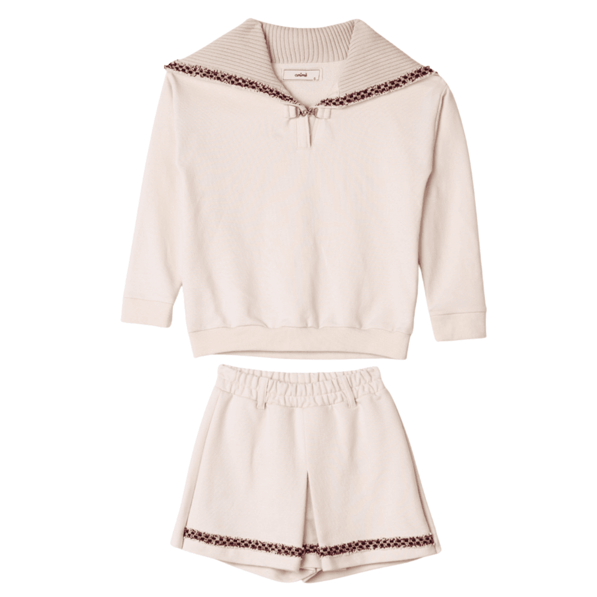 Roupa Infantil Animê. O conjunto infantil feminino Animê em moletom careca com gola em tricô é a escolha perfeita para meninas que buscam conforto aliado a um visual sofisticado e delicado. Ideal para dias mais frescos, combina estilo moderno com acabamento refinado. A blusa de manga longa possui modelagem confortável e elegante, com destaque para a gola ampla em tricô canelado que adiciona charme e personalidade ao look. O detalhe em acabamento contrastante na gola e na barra do short traz um toque especial e diferenciado. O short em moletom conta com cós elástico que proporciona ajuste perfeito e liberdade de movimentos, garantindo conforto durante todo o uso. O tecido é macio, aconchegante e ideal para meia-estação.