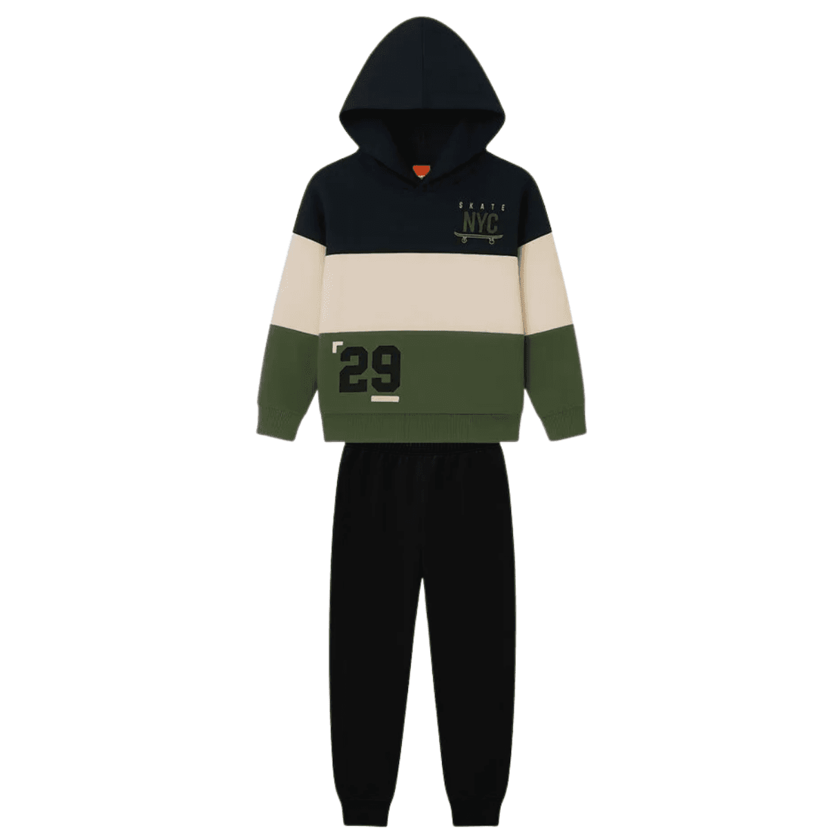Roupa infantil Kyly. Inspirado no estilo urbano e cheio de personalidade, este conjunto infantil menino da Kyly é perfeito para acompanhar os pequenos em momentos de diversão com muito conforto e atitude. Um visual moderno que traduz o espírito leve e aventureiro da infância. A blusa é confeccionada em moletom peluciado 100% algodão, garantindo toque macio, aconchego e excelente conforto térmico para os dias mais fresquinhos. A modelagem confortável permite liberdade de movimentos, enquanto os acabamentos em ribana na barra e nos punhos proporcionam melhor ajuste ao corpo. O capuz adiciona funcionalidade e estilo, e a estampa lettering com referência “NYC” e numeração traz um ar esportivo e contemporâneo. Os recortes em blocos de cor valorizam o design, criando um visual moderno e versátil.