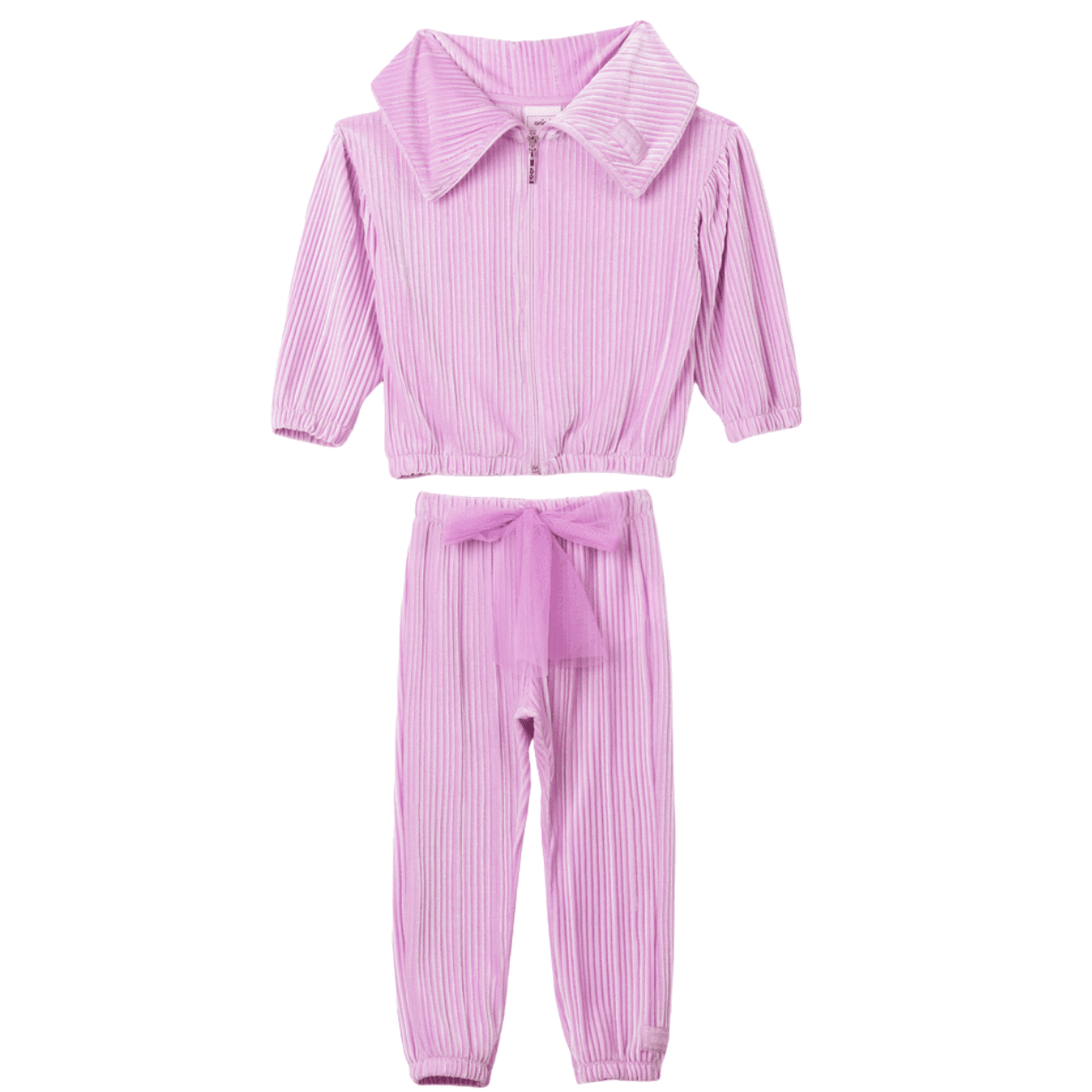 Roupa Infantil Animê. Esse conjunto é um ícone da coleção. Reflete o estilo e personalidade fashion da marca. Composto por uma jaqueta com capuz e calças combinando, ambos com textura plissada. O visual é complementado por um laço de tule na cintura.
