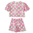 Roupa Infantil Animê. Este conjunto Animê traduz o verão em uma explosão de cor e personalidade! A blusa de manga bufante e o short combinam a estampa exclusiva da Minnie em uma padronagem floral vibrante. O verde menta é a base perfeita para as flores em tons de rosa intenso, criando um contraste alegre e sofisticado. O pingente exclusivo da marca na blusa adiciona um toque de charme extra. Ideal para produções coordenadas, cheias de estilo e conforto para dias ensolarados!
