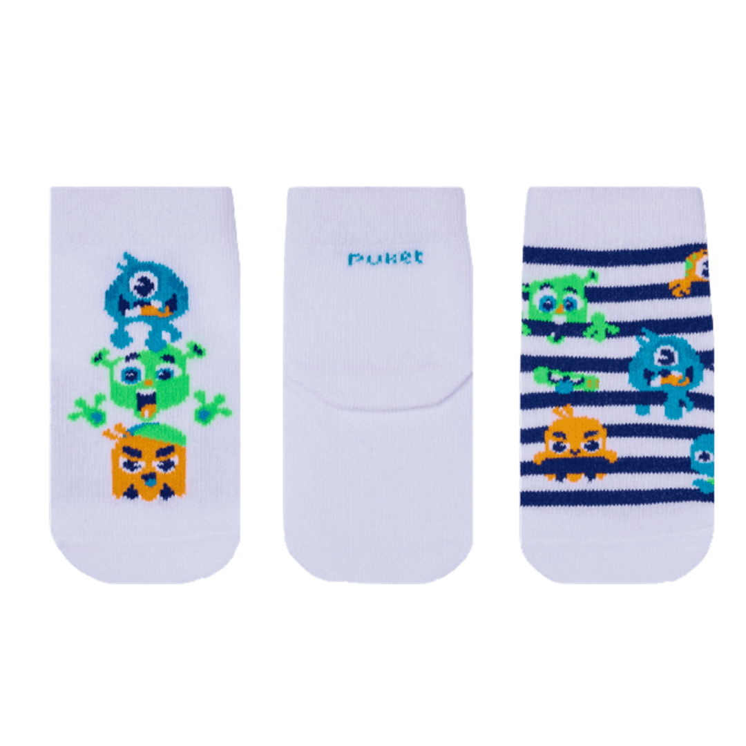 Kit com três pares de meias em algodão macio, sendo duas com desenhos divertidos de monstrinhos, e uma em cor lisa.