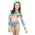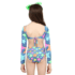 Moda praia Siri Kids. Biquini infantil estampado com calcinha cós alto e cropped manga longa.