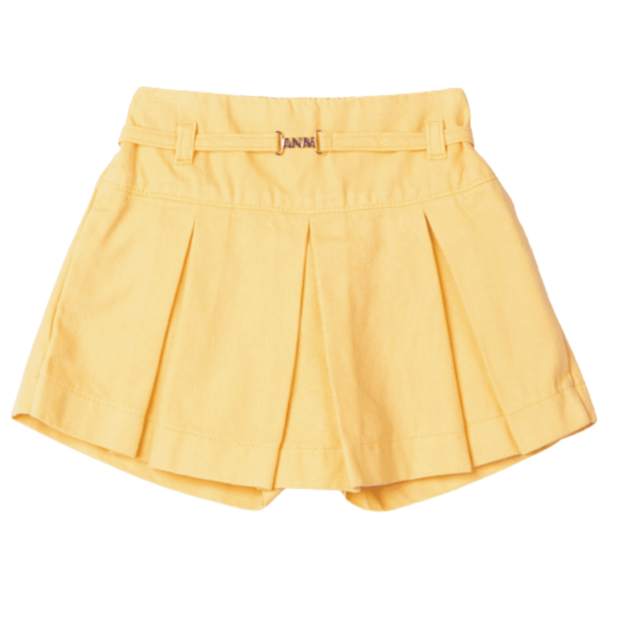 Roupa Infantil Animê. O short saia Animê é puro charme e sofisticação! Em tom amarelo vibrante, a peça destaca-se pelas pregas plissadas, que trazem movimento e elegância ao visual. O cinto no mesmo tecido, com fivela personalizada Animê, reforça a estética fashionista da marca, adicionando um toque delicado ao look. A modelagem levemente evasê garante conforto e liberdade, enquanto o cós com ajuste elástico nas costas proporciona caimento perfeito. Ideal para composições alegres e modernas, traduzindo o DNA autêntico e criativo da Animê.
