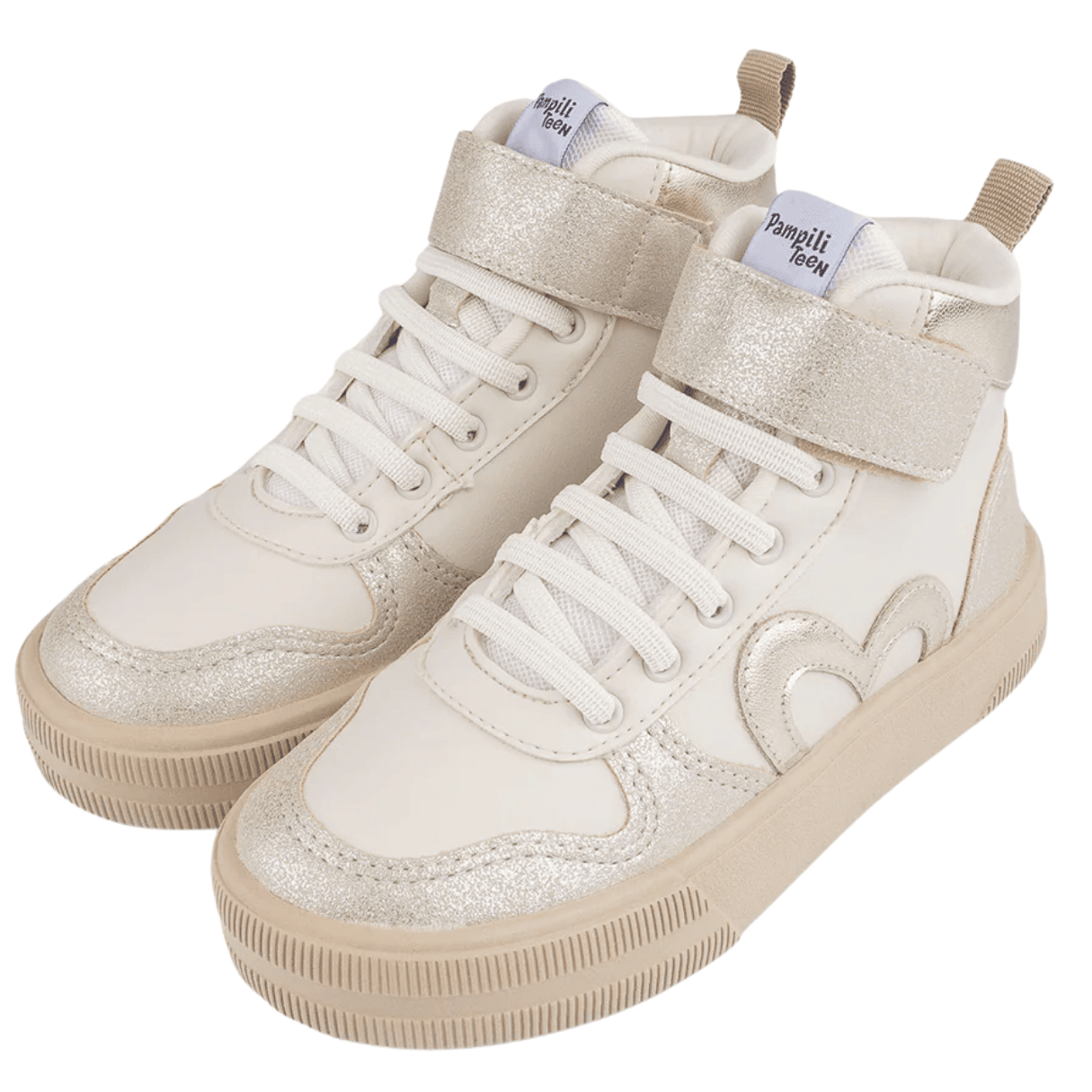 Charmoso e elegante, esse tênis teen nude com dourado glitter é perfeito para quem busca um calçado versátil e cheio de brilho. Seu cano alto adiciona um toque moderno ao visual, enquanto os detalhes em glitter com textura de camurça garantem sofisticação e delicadeza. O design lateral em formato de coração deixa o modelo ainda mais especial.