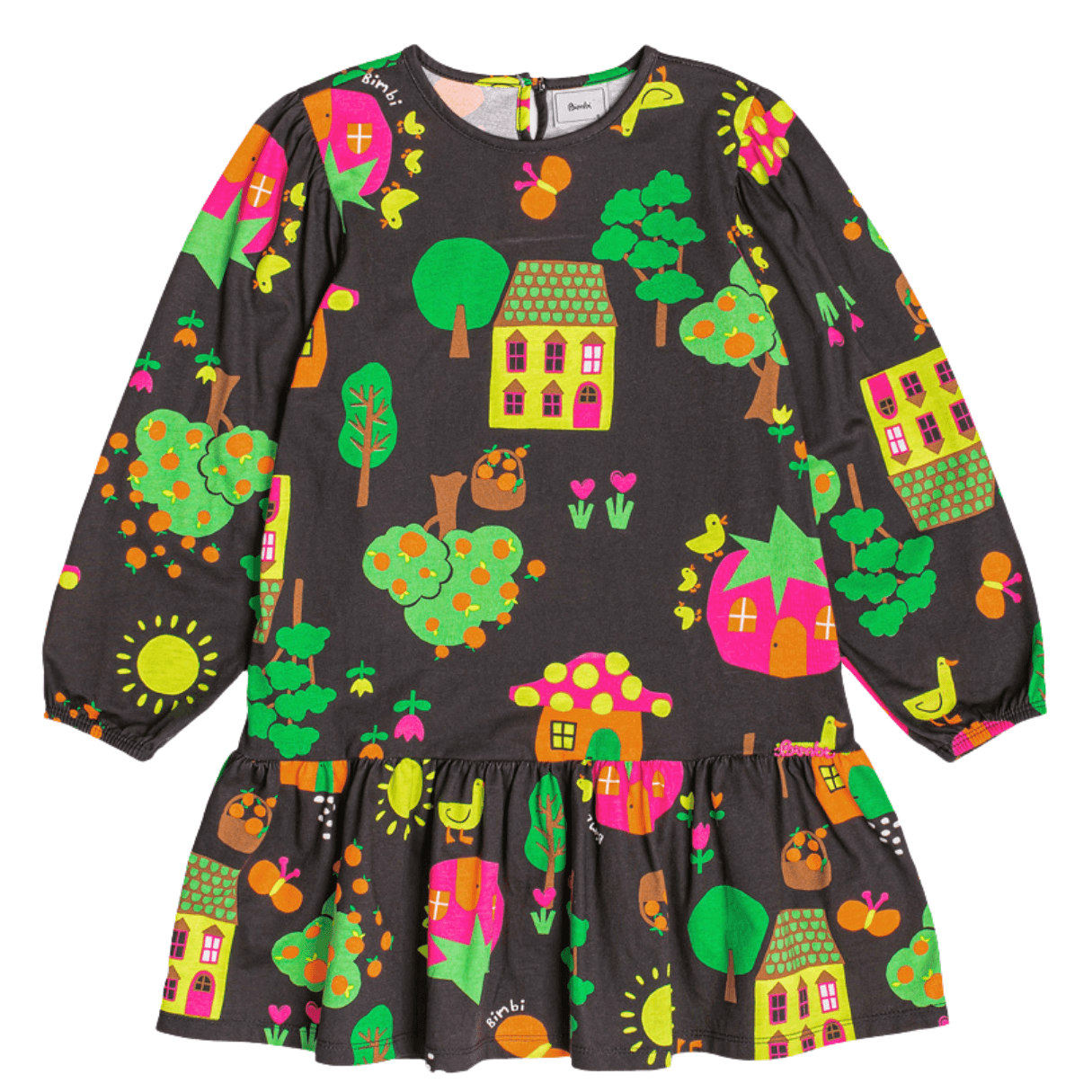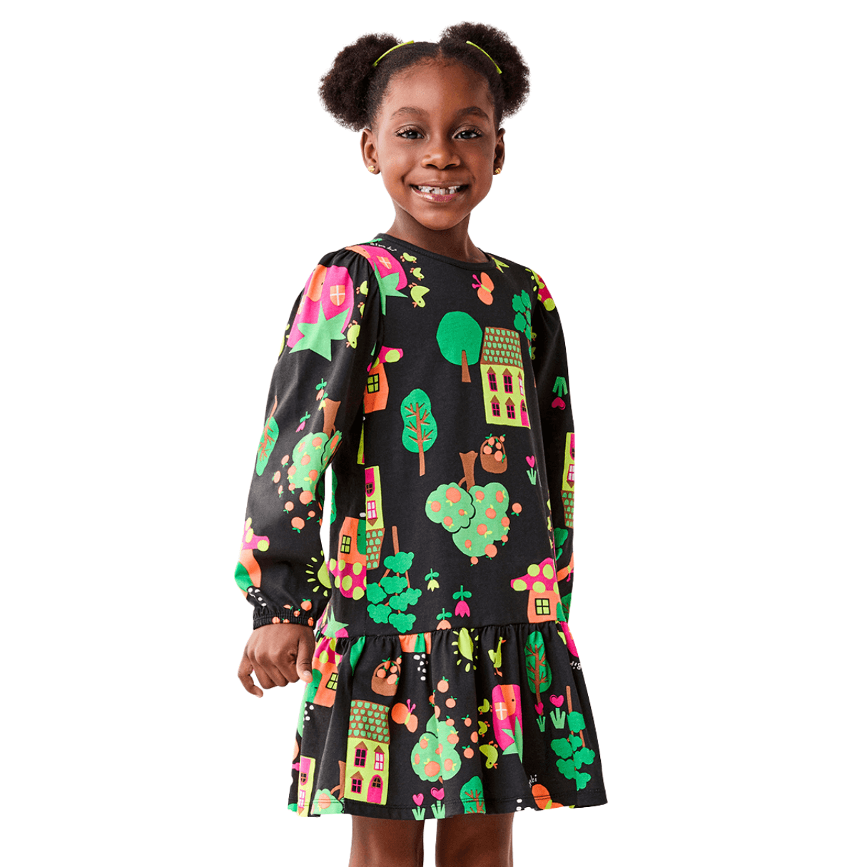 Roupa Infantil Bimbi. O Vestido Manga Longa Preto de Fazendinha une conforto e imaginação no inverno infantil. Produzido em tecido macio, oferece bem-estar durante todo o dia. A estampa de fazendinha traz um ar lúdico e divertido, enquanto a manga longa garante proteção térmica. A cor preta facilita combinações com diferentes acessórios e casacos. Uma peça pensada para mães que valorizam conforto, praticidade e um visual criativo no Inverno 26.