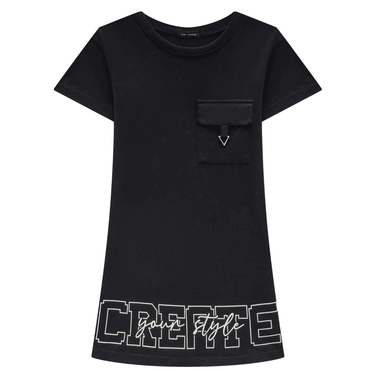 Roupa juvenil Vic&Vicky. O vestido tee dress em meia malha é uma peça extremamente confortável e versátil, perfeita para o dia a dia e ocasiões casuais. Seu design despojado e a malha macia o tornam ideal para criar looks práticos e estilosos. A estampa adiciona um charme especial à peça.